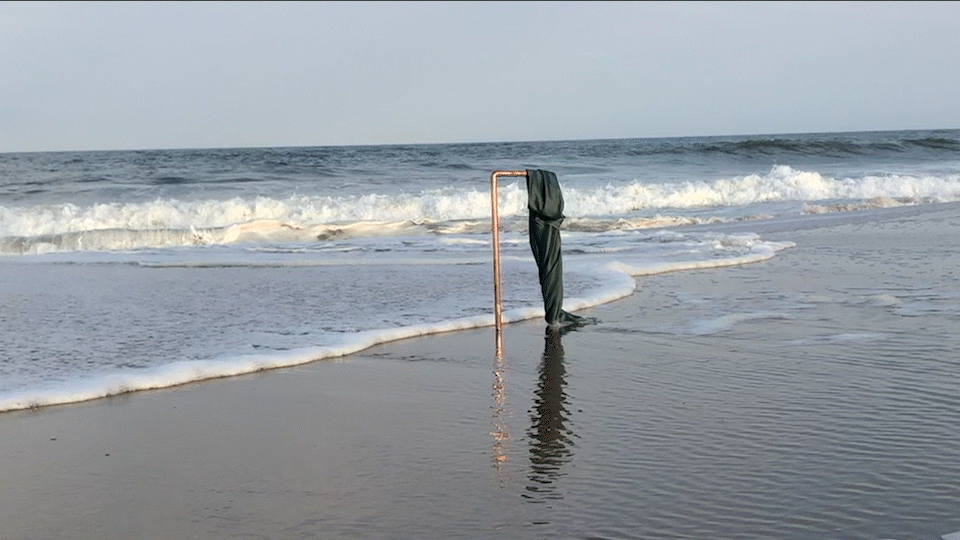 This photograph is a still from a performance video of the painting’s creation, particularly as it’s bound to a cliff side facing the open water, calling out to it like a siren, while it dries in the sandy and salty wind.